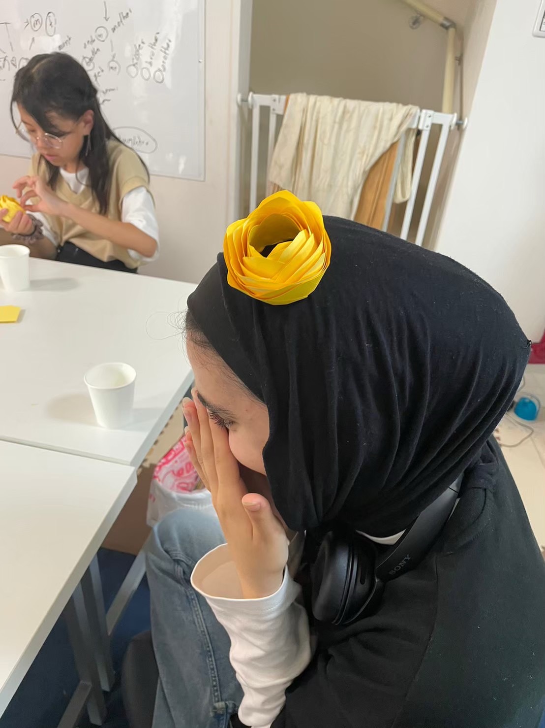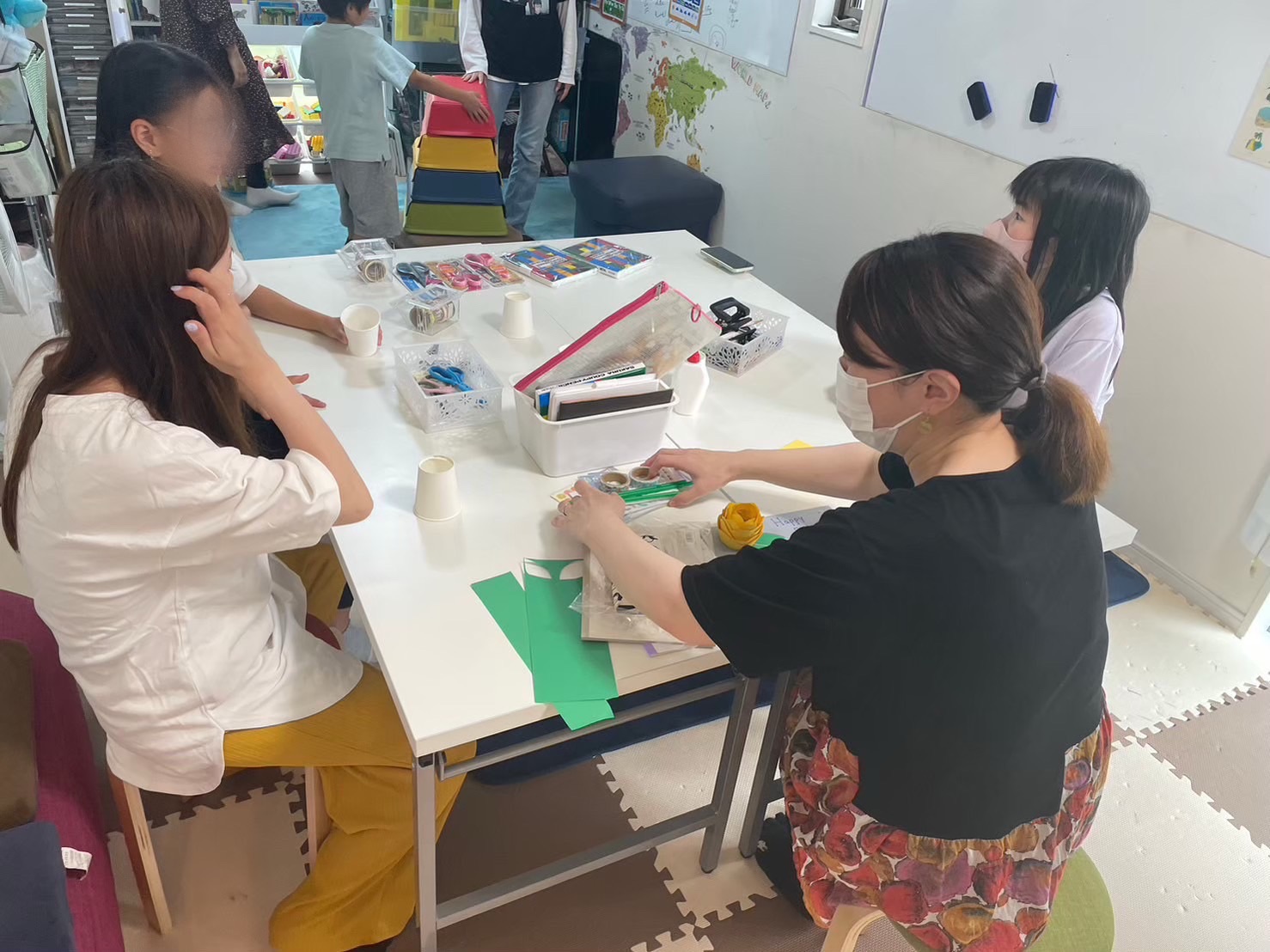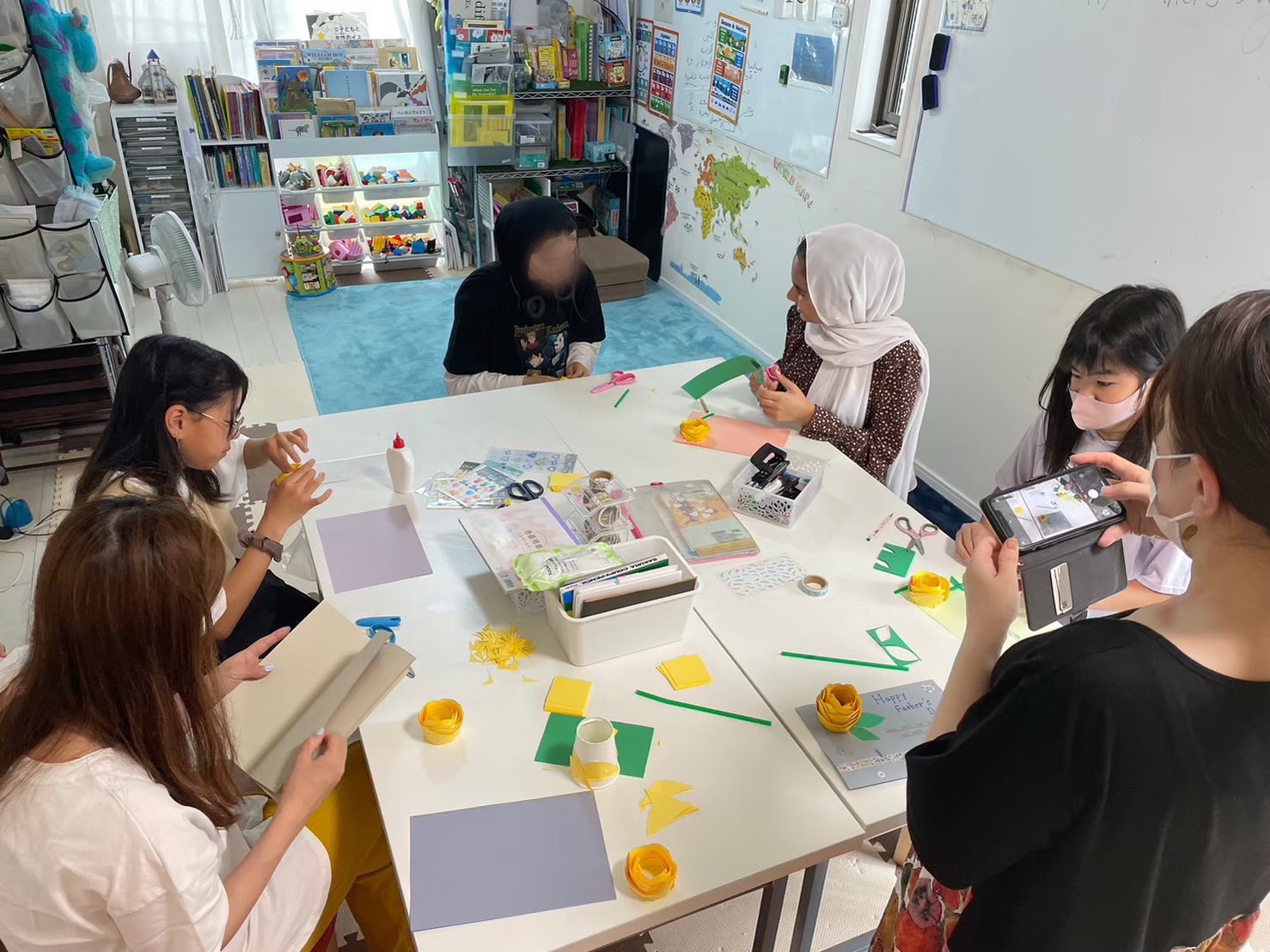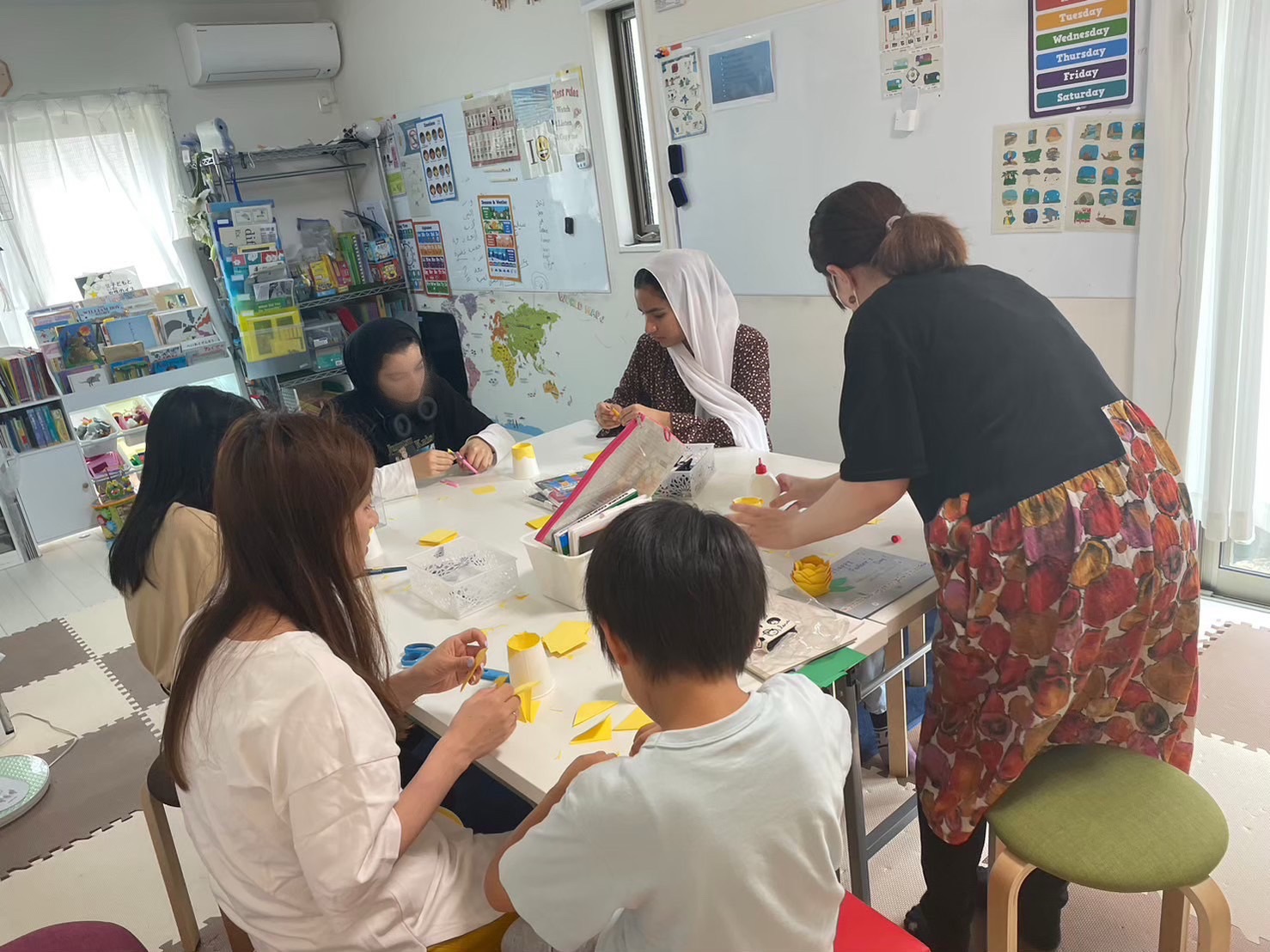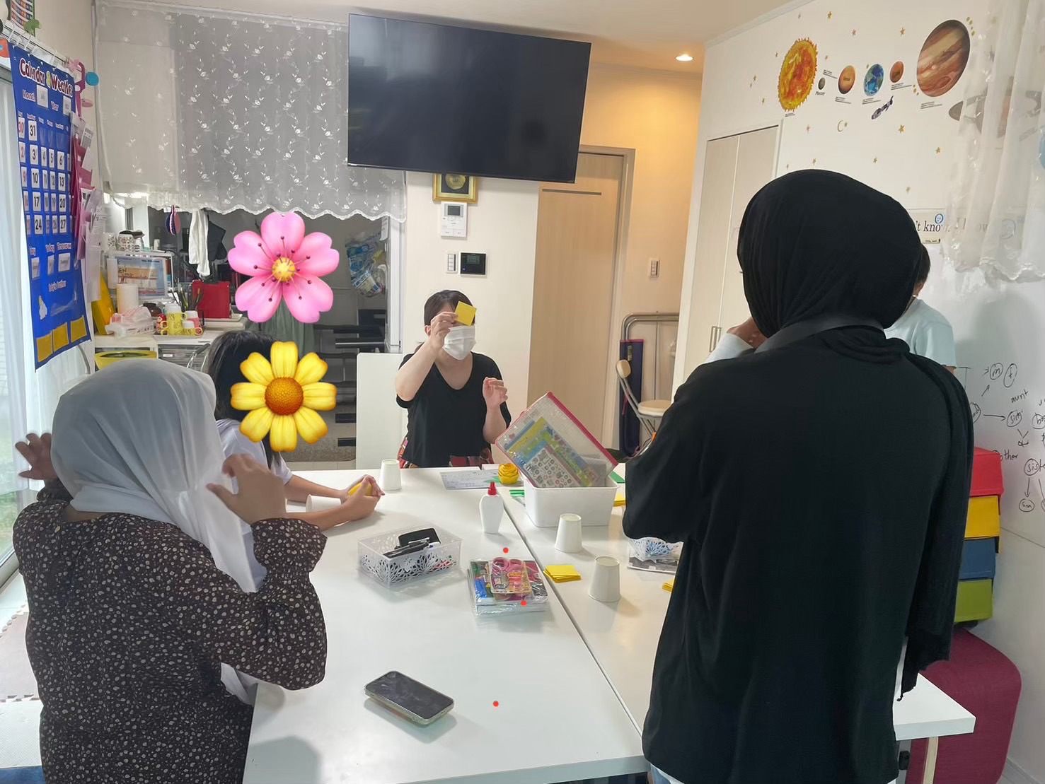 英語は話せるけれど、英語を教えるのは初めての外国人講師に、保育士の免許を持ち英語の幼稚園での経験も有る講師に、工作やチャイルドケアについての講義を英語で受けました。